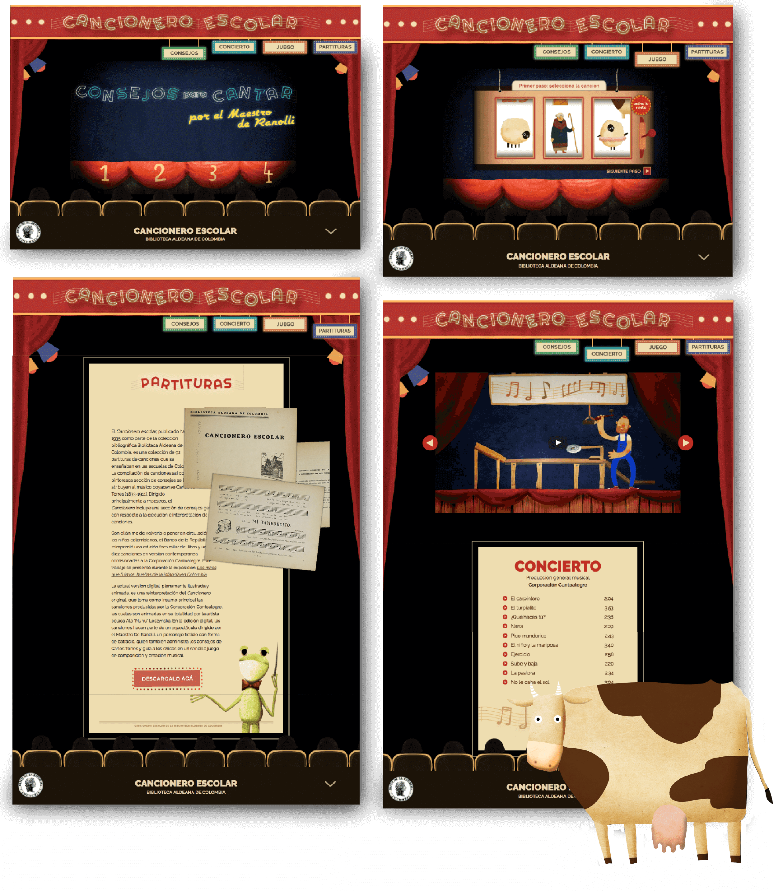 El Cancionero escolar se publicó originalmente en 1935 como parte de la colección Biblioteca Aldeana. En esta versión digital nuestro trabajo inició con la escritura del guión, diseño de personajes originales, ilustración y animación (a cargo de Nunu, nuestra artista de la casa), diseño de interfase y programación.